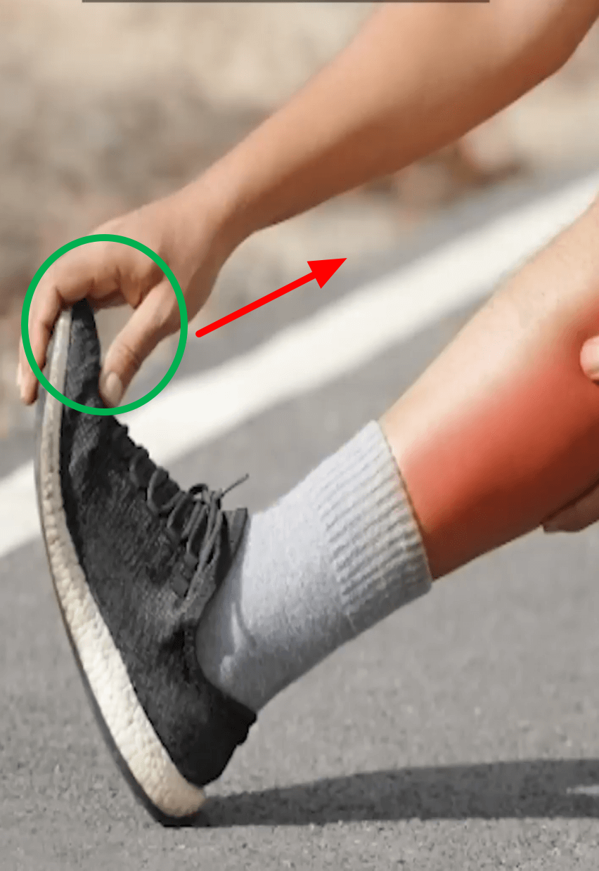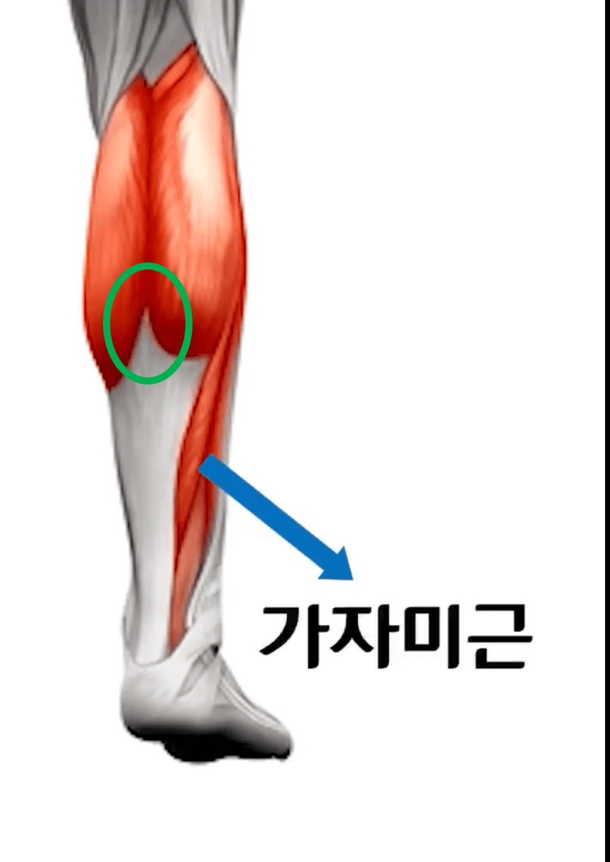 그 아래쪽 가자미근에 쥐가 난 경우에는 이곳을 (초록색 동그라미) 엄지손가락으로 꾹 누르고 있으면 됩니다.