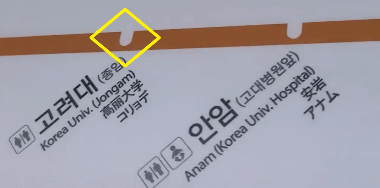 이렇게 역을 보면 한쪽 방향이 파여진 표시(노란색)가 있습니다. 이것은 바로 문이 열리는 방향을 표시하는 것입니다.