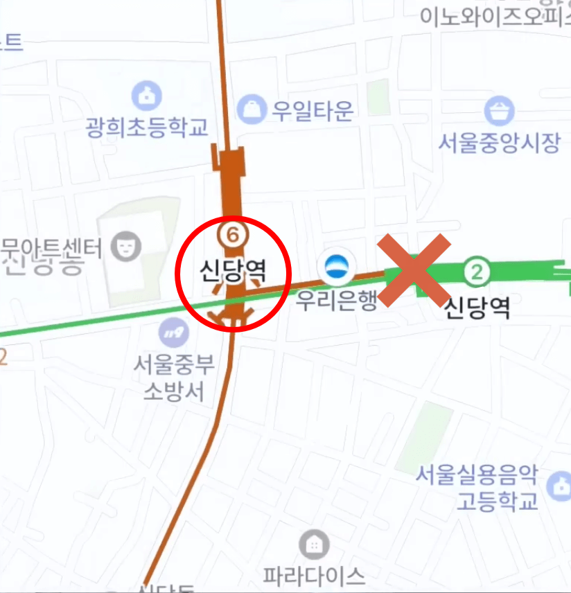 심지어 같은 역이더라도 호선이 다르면 요금을 한 번 더 내야 합니다. 예) 신당역 6호선 - 2호선 (빨간색 동그라미)
