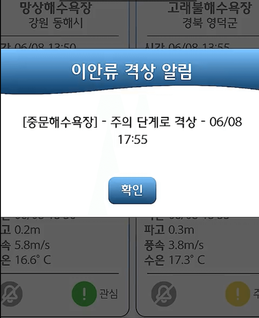 이 앱(안전해)에서 해수욕장별 이안류 위험도를 실시간으로 확인할 수 있고 위험 알람도 받을 수 있습니다.