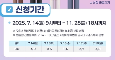 - 첫 주(7/14~18)에는 신청자가 몰려 불편이 생길 수 있어, 사업자등록번호 끝자리 기준 5부제로 운영됩니다.