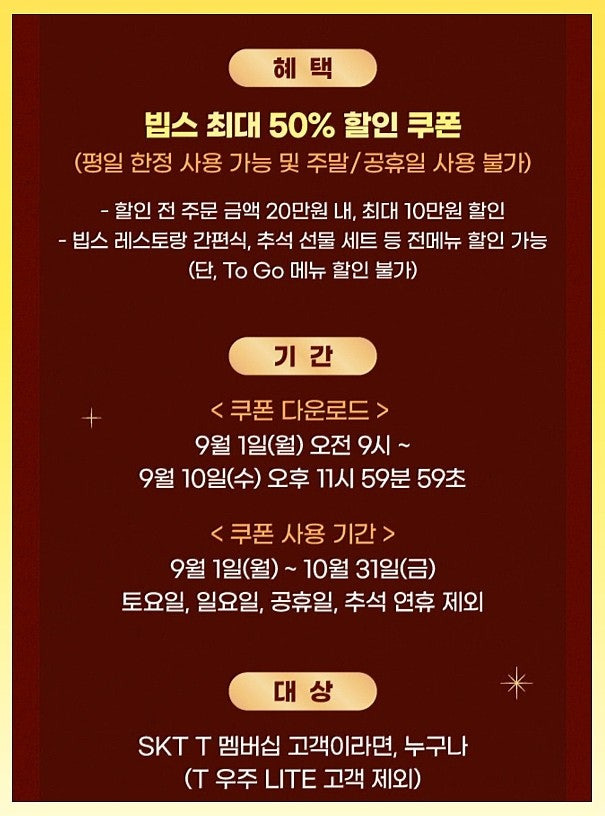✔ 9/1 ~ 10/31 평일 한정, SKT 고객 대상 최대 50% 할인!